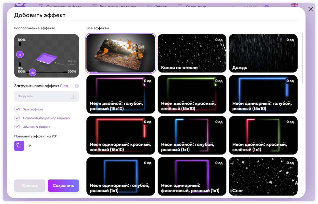Доступно более 30 вариантов, часть из них бесплатны, стоимость других указана на самом эффекте. Так же можете загрузить свой эффект (видео формата .mov, с прозрачностью, размером не более 1Гб). Доступно регулирование положения и размера эффекта относительно изображения.