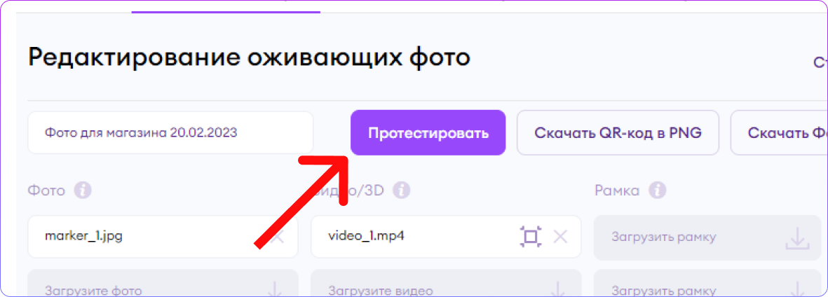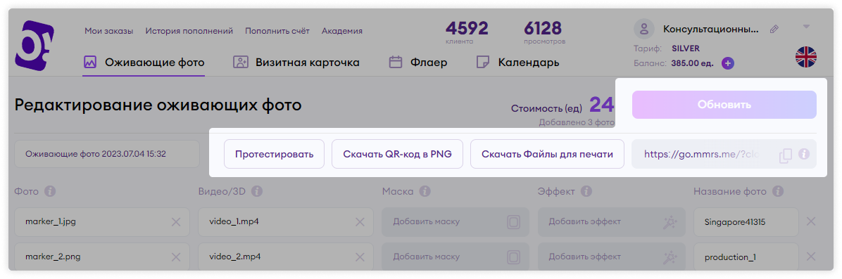 Теперь можете ваши материалы оживить с помощью наведения на QR-код. Если вы не размещали QR-код на загруженных изображениях, для передачи клиентам, рекомендуем распечатать их отдельно или передать в виде ссылки, которая размещена рядом с QR-кодом.