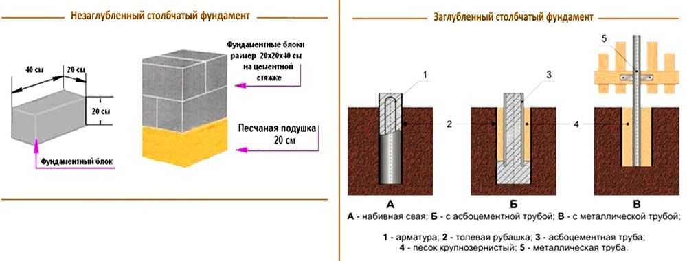Незаглубленные конструкции применяют при строительстве бань, беседок, гаражей. Их устанавливают на утрамбованные подушки их песка. Для более тяжелых сооружений вместо стандартных блоков применяют камень, бетон с армированным упрочнением. Легкие опоры создают из дерева.