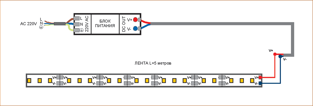Этот способ, как правило, используется в случае подключения отрезка осветительного прибора равному 5 м. Можно пробовать подключать и более длинные отрезки, если это позволяет сделать мощность БП. При подключении руководствуйтесь этой схемой.