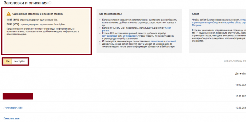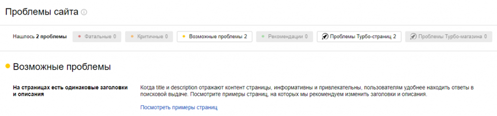 Информацию о наличии дублей страниц, обнаруженных на сайте роботом Яндекса, можно увидеть в разделе «Диагностика». Уведомление о страницах с одинаковыми метатегами title и description выглядят так: