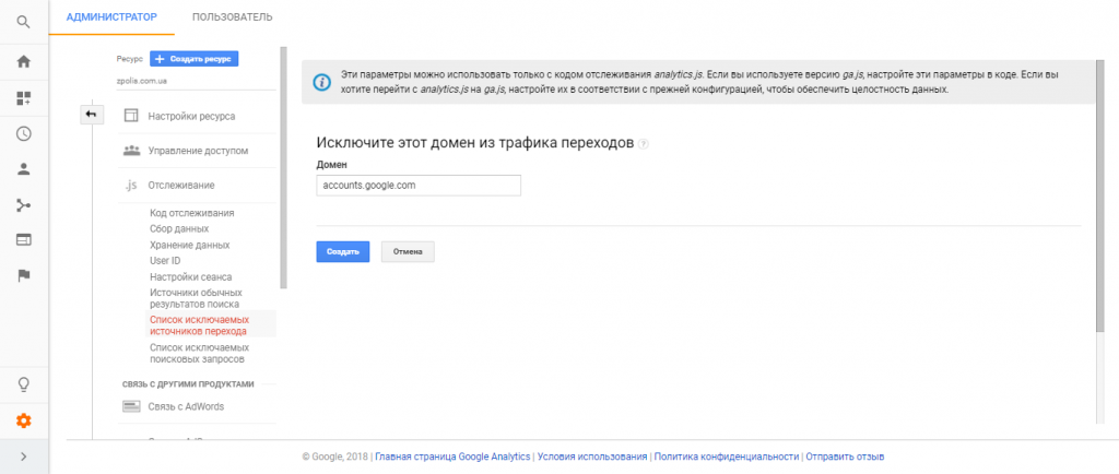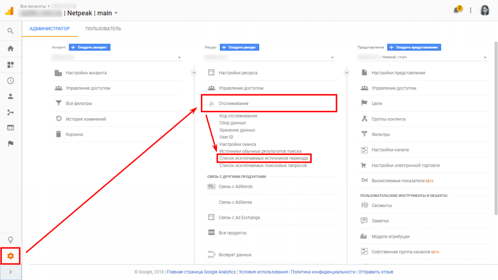 В аккаунте Google Analytics перейдите в настройки администратора на уровень ресурса. Выберите раздел «Отслеживание» и нажмите «Список исключаемых источников перехода».