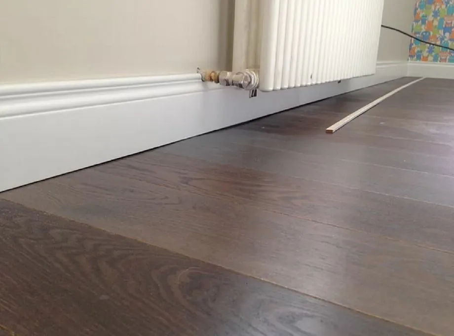 Толщина дощечек должна быть меньше размера щели. Детали обрабатываю клеящим составом, потом аккуратно вбиваю молотком в прореху между планкой плинтуса и полом. Поверхность шлифую, окрашиваю в тон покрытия.