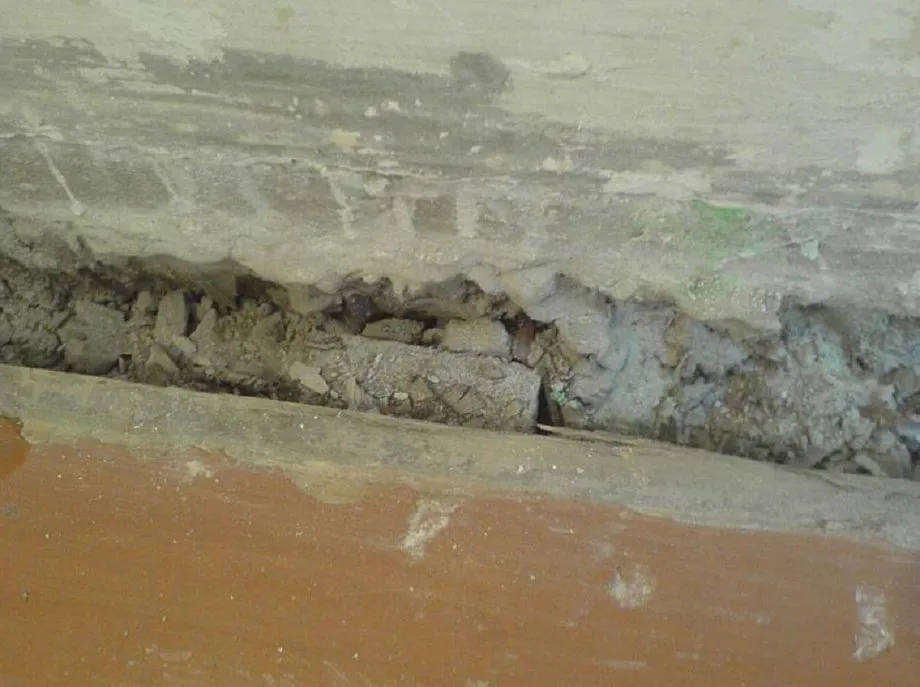 Если размер дефектов больше 7 см, то полости предварительно уплотняю строительным мусором и измельченным кирпичом, кусками линолеума или пенопласта. Наполнитель удешевит ремонт и укрепит конструкцию. Сырье должно заполнять большую часть объема щели, при этом не выходить за границы. В качестве закрепителя подойдет полиуретановая пена или клей ПВА с опилками.