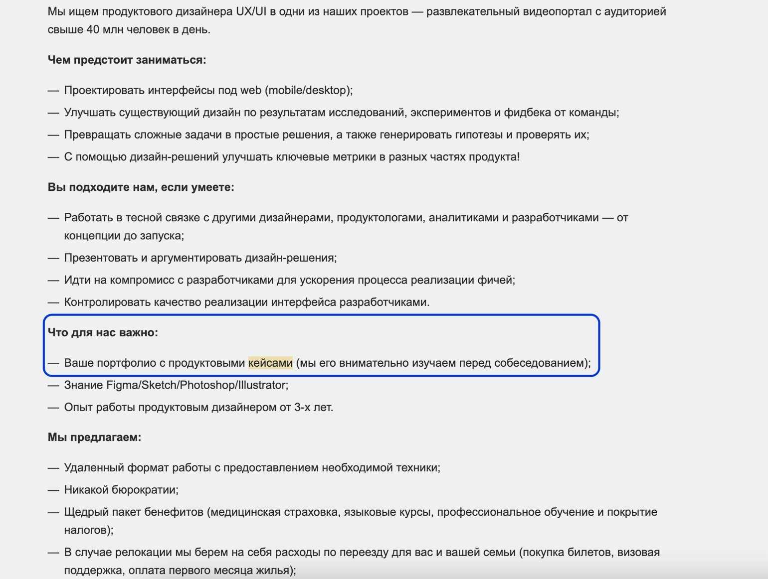В объявлении о вакансии UX/UI-дизайнера чётко сказано, что до начала разговора с соискателем работодатель хочет посмотреть кейсы о предыдущих проектахСкриншот: hh.ru / Skillbox