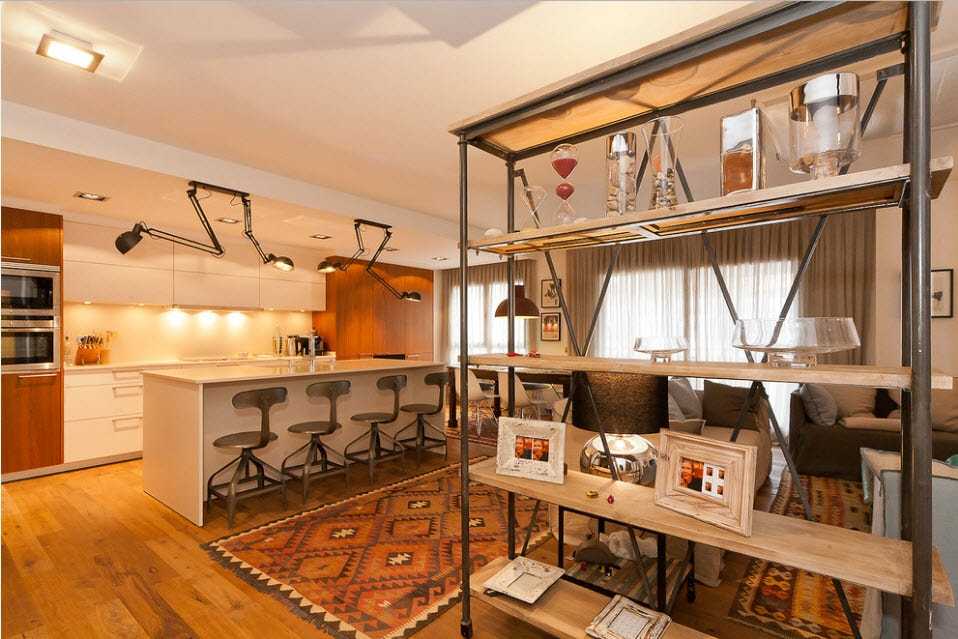 В большой студии проблема размещения мебели стоит не так остро, поэтому зонирование играет декоративную роль. Чаще всего она служит здесь украшением интерьера, попутно выполняя функцию хранения. Поэтому основной акцент делается на ее внешнем виде. Приветствуются необычные решения — комбинации открытых и закрытых отсеков, несимметричные расположения полок, использование стеклянных и других декоративных элементов, подсветка.