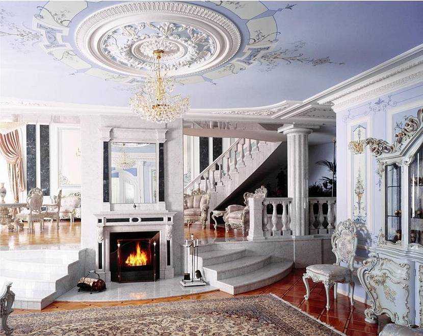 - Интерьер благоволит к колоннам, статуям и строгим орнаментам. Правда первые утратили несущую функцию и выступают только в роли декораций. Поэтому их выполняют из легких материалов.