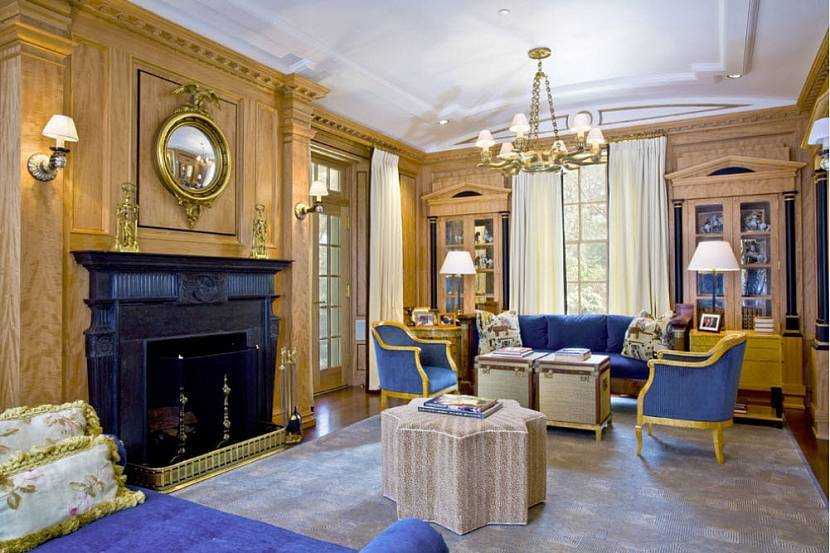 При воспроизведении интерьера русской усадьбы стоит добавить нотки роскоши. Здесь, помимо деревянной отделки и дорогой мебели, могут присутствовать разнообразные элементы декора в виде картин, штор, статуэток, ковров. Обивка на мебели – креслах и диванах – может быть из кожи, замши, гобелена. В этом случае центральным акцентом в доме станет камин.