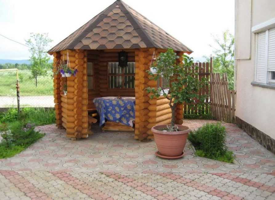 Установлена она на мощеную площадку из плитки. Нижняя часть стен заменена резбленными деревянными планками. На крыше поверх обрешетки настелена черепица. Тематическая статья: «Возведение беседки круглой формы».