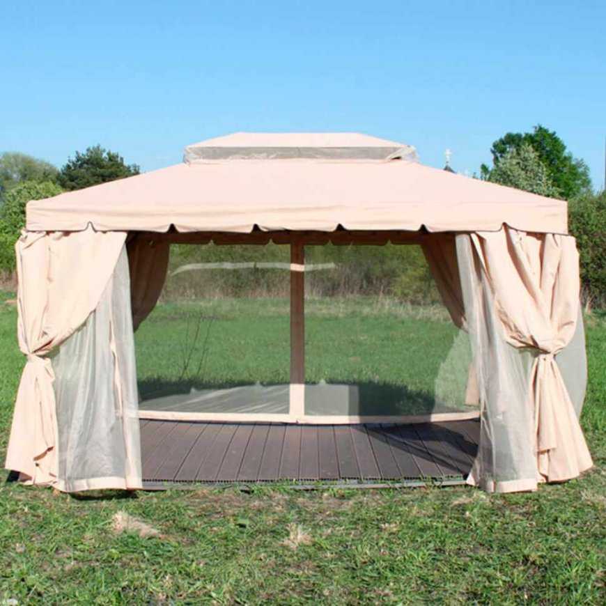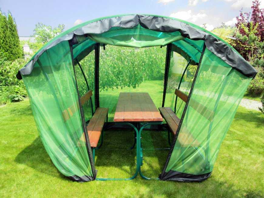 Подобные беседки для дачи наиболее популярны, но они, как и первый тип, не обладают 100% защитой от непогоды.
