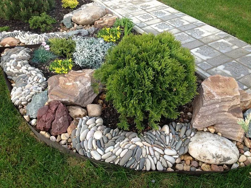 Удачно сделать акцент на объекте можно с помощью больших булыжников, гранита разных оттенков. В щели между крупными камнями, можно поместить камушки-голыши.