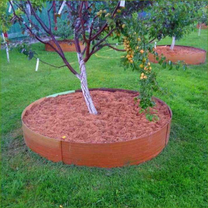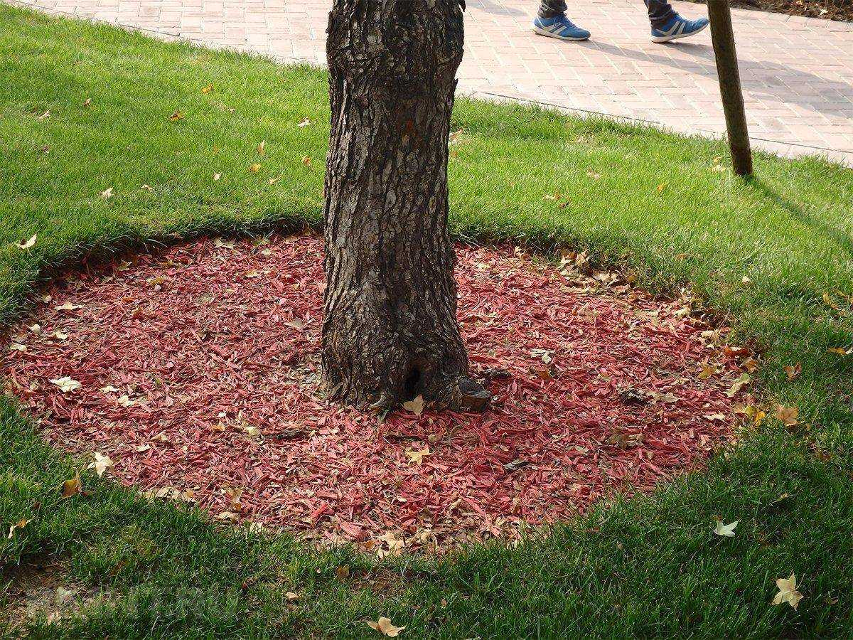 При обработке приствольных кругов, между стволом дерева и краем области обработки мульчей должно быть расстояние от 1.5 до 3 м.