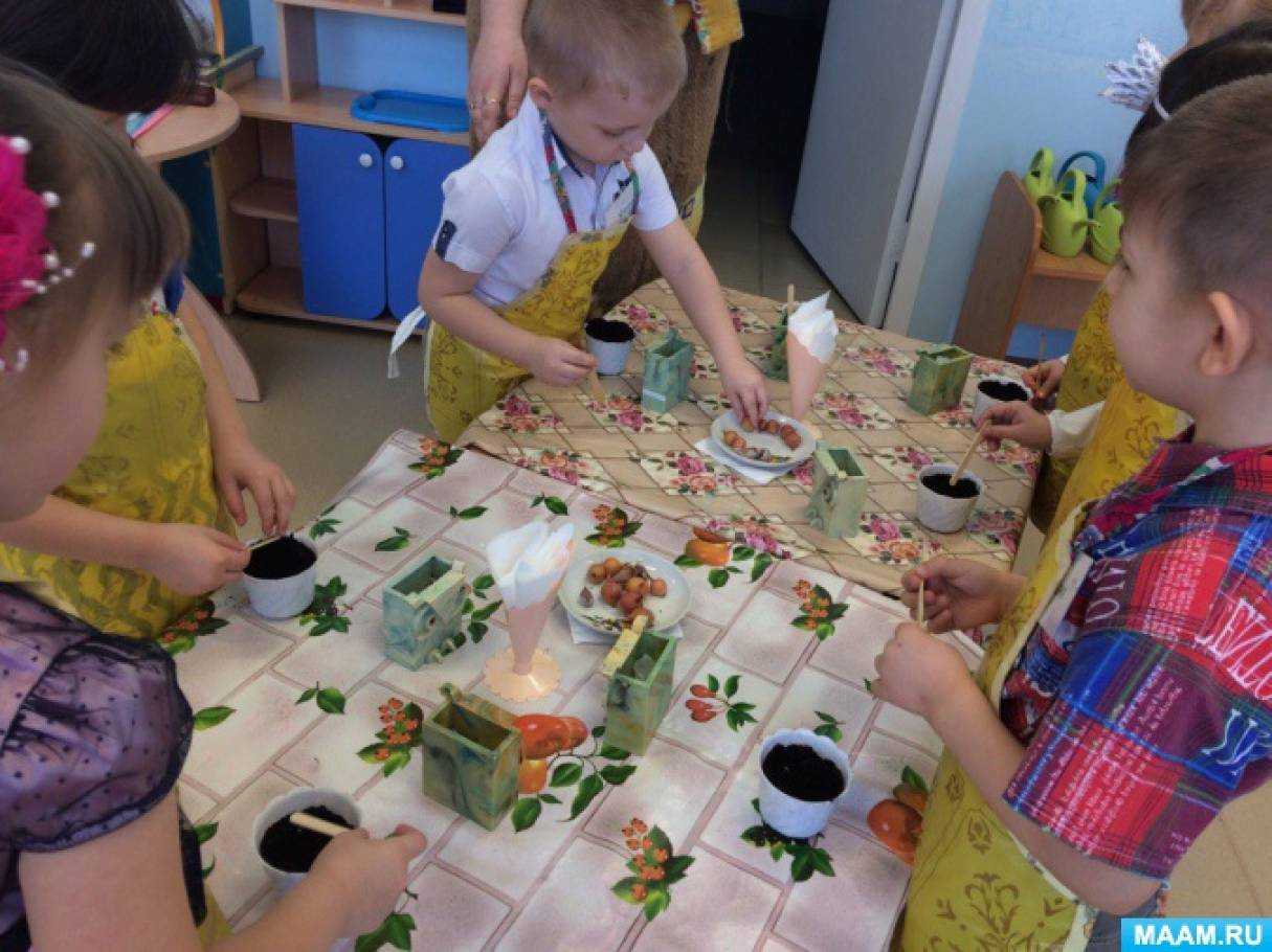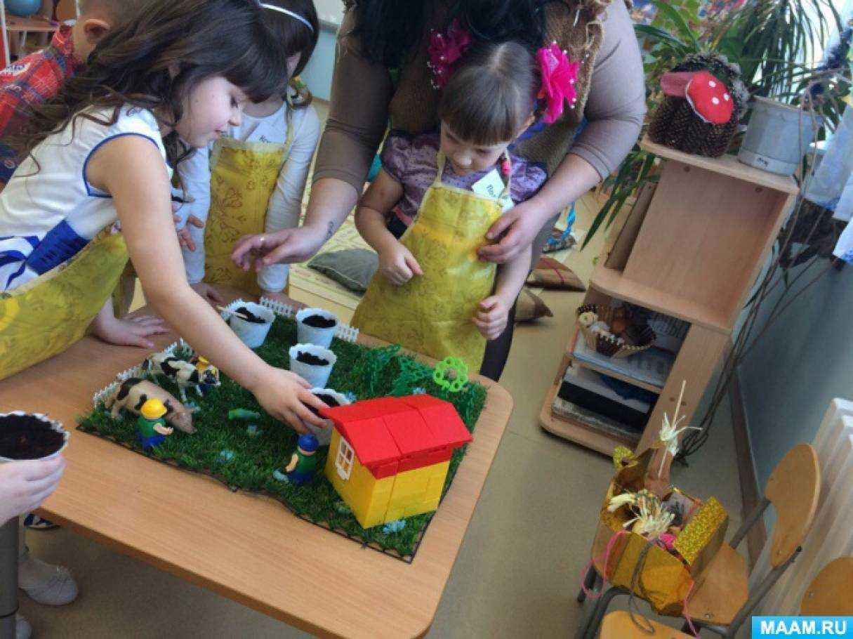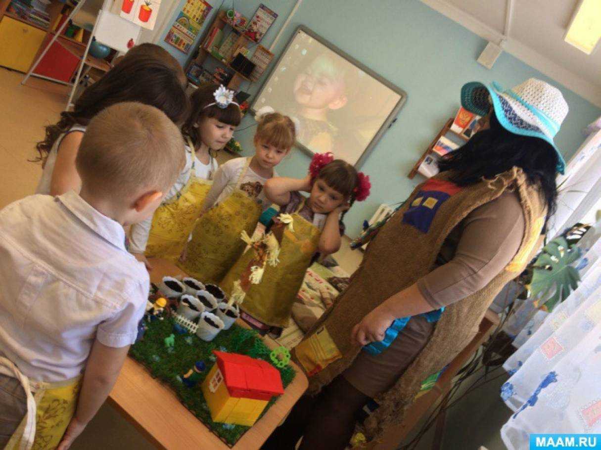 Пугало: правильно! Именно их я и принес вам в подарок – лук и чеснок, чтобы вы не болели, росли сильными и крепкими. Но это ребята семена, они еще должны вырасти. Давайте вместе сделаем в группе огород на подколеннике и посадим семена. А охранять его будет мой младший брат, у него пока еще нет своего огорода, он с удовольствием поохраняет ваш. Давайте займемся посадкой семян.