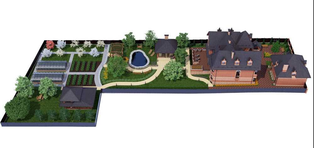 Это довольно просторный участок, где можно легко поместить не только большой огород и сад, а также основную постройку с гаражом и террасой, гостевой домик, спорт площадку, детскую зону, беседку, баню и т.д. Грядки можно планировать в зависимости от рельефа территории и солнечного освещения. Так, их можно расположить сбоку от дома или в дальнем углу участка, на приличном расстоянии от игровой зоны и плодовых деревьев.